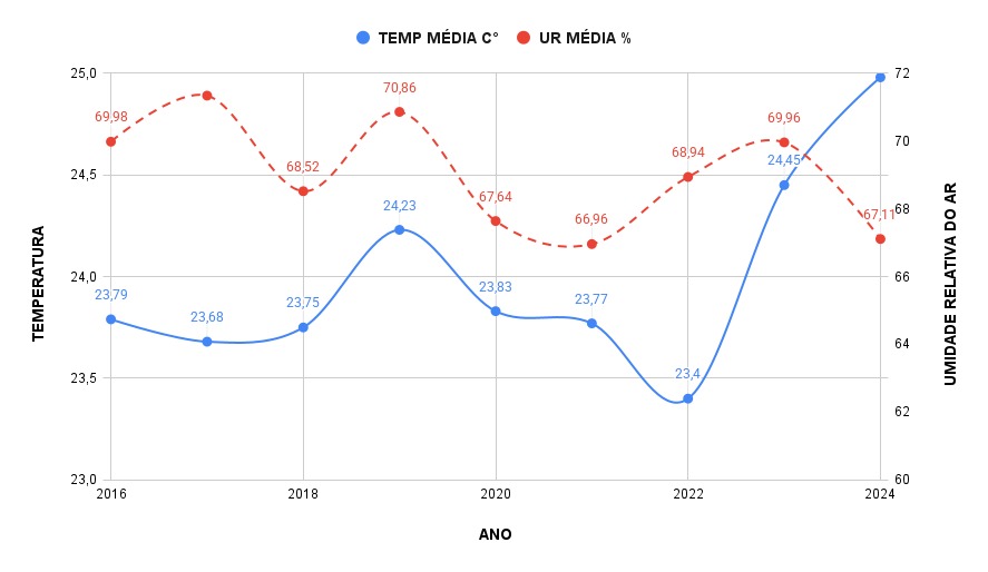 Segundo explica a diretora de Assuntos Climáticos, Taina Ferreira, neste período, é preciso observar uma situação atípica, verificada em 2024, quando houve altas temperaturas e baixa umidade relativa do ar, criando um cenário excepcional, conforme mostram os dados da estação meteorológica local (CIIAGRO – Centro Integrado de Informações Agrometeorológicas) (veja abaixo).